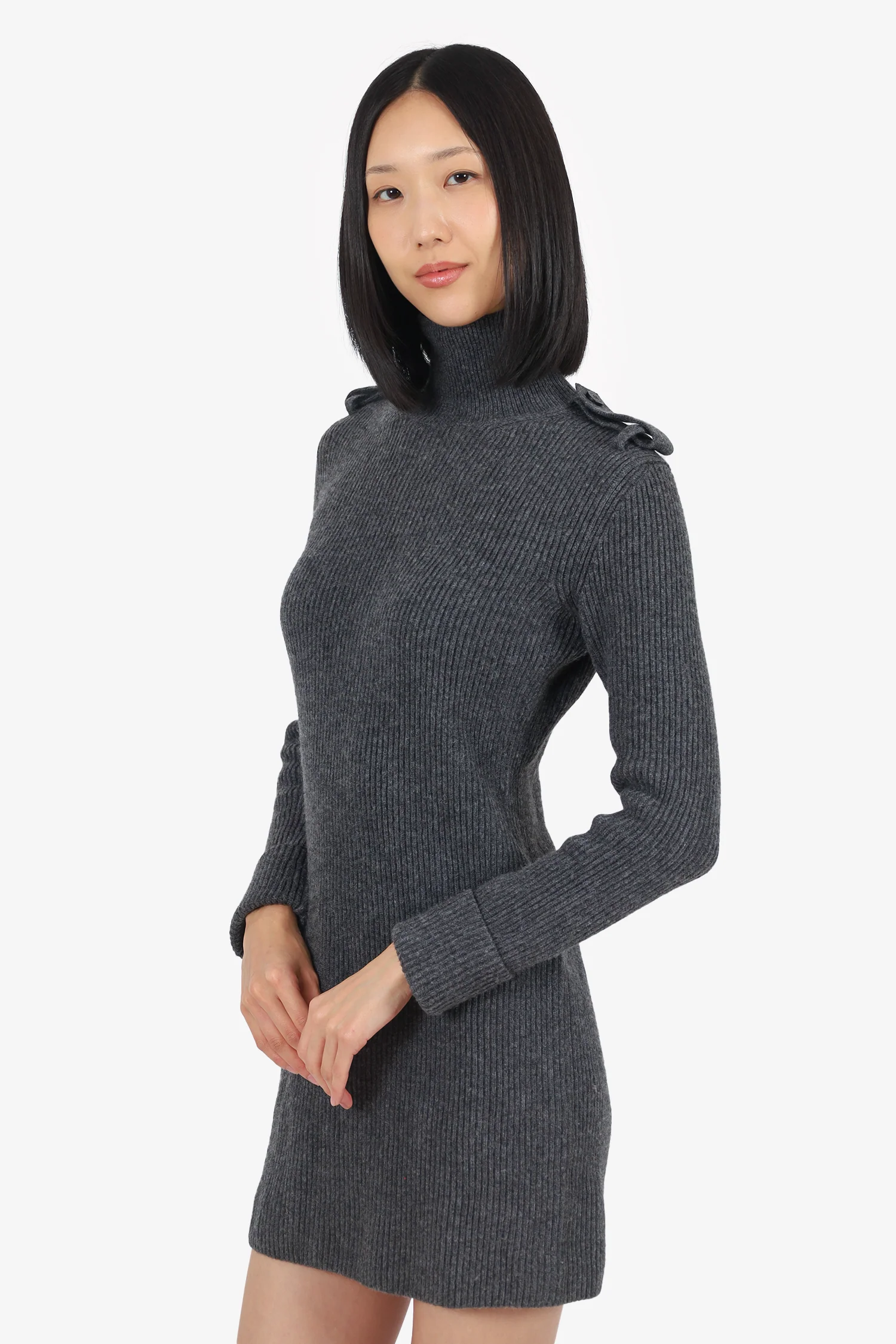 Alexander McQueen Grey Wool Ribbed Knit Turtleneck Mini Dress. Pull-on. Epaulettes with button detail. Tonal stitching.