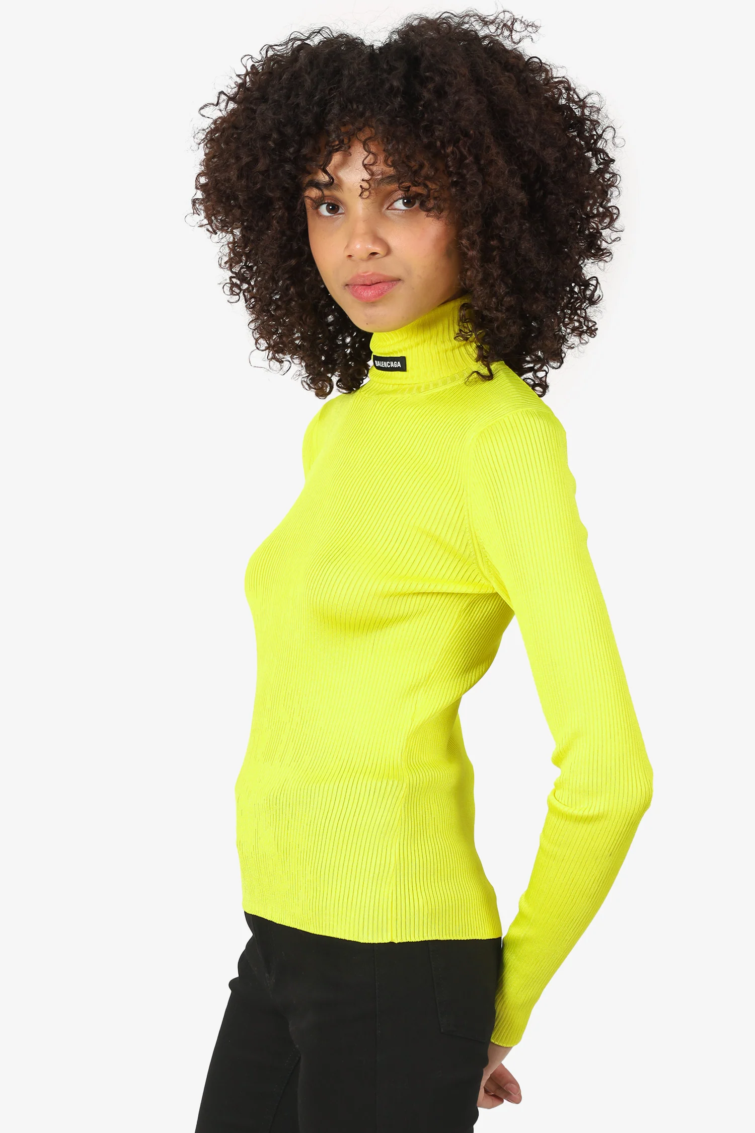 Balenciaga Yellow Ribbed Tech Turtleneck Sweater. Pull-on. Tonal stitching.