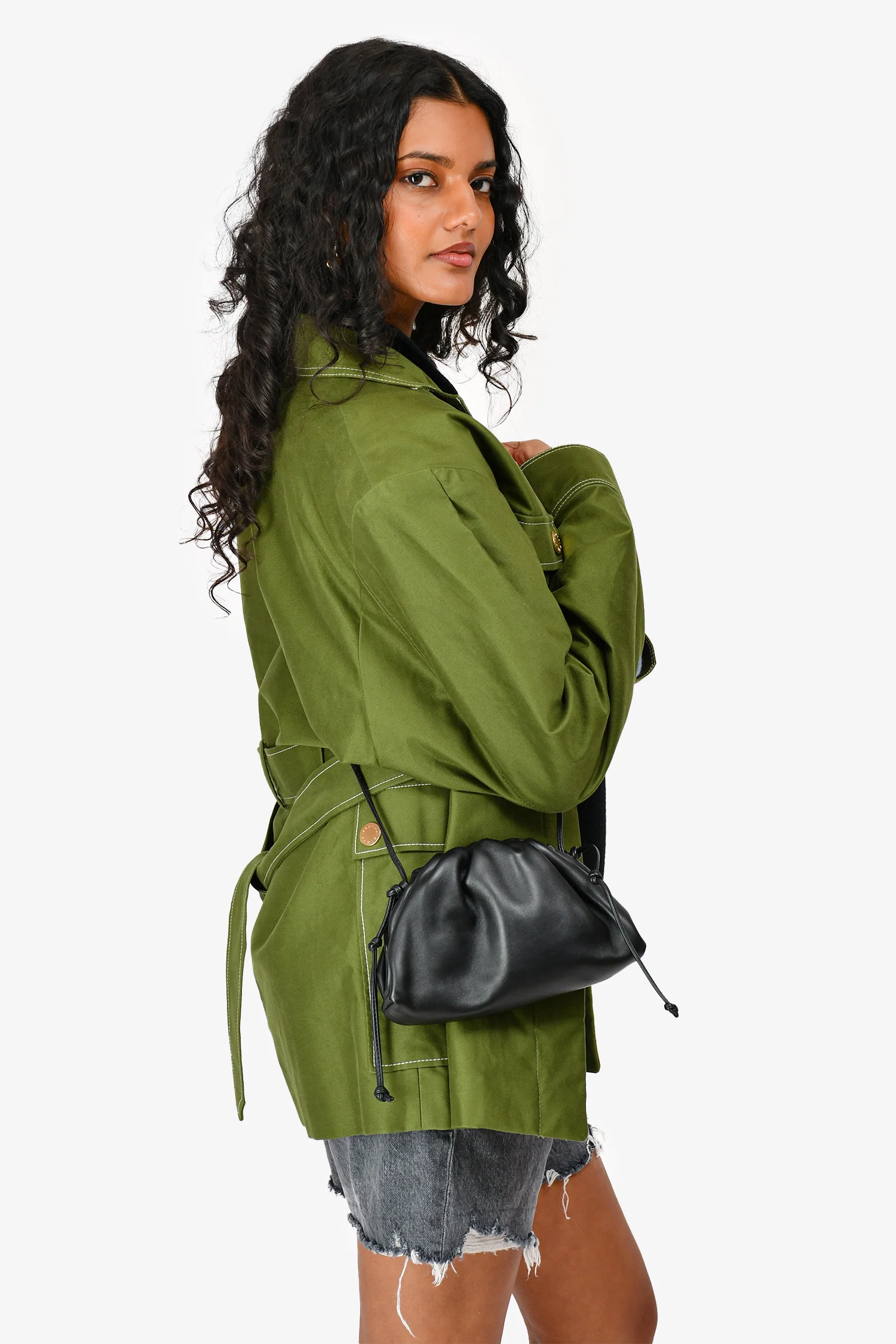 Bottega Black Smooth Leather Mini Pouch Crossbody. Top magnetic closure. Silver-tone hardware. Crossbody strap. Ruched throughout. Tonal stitching.