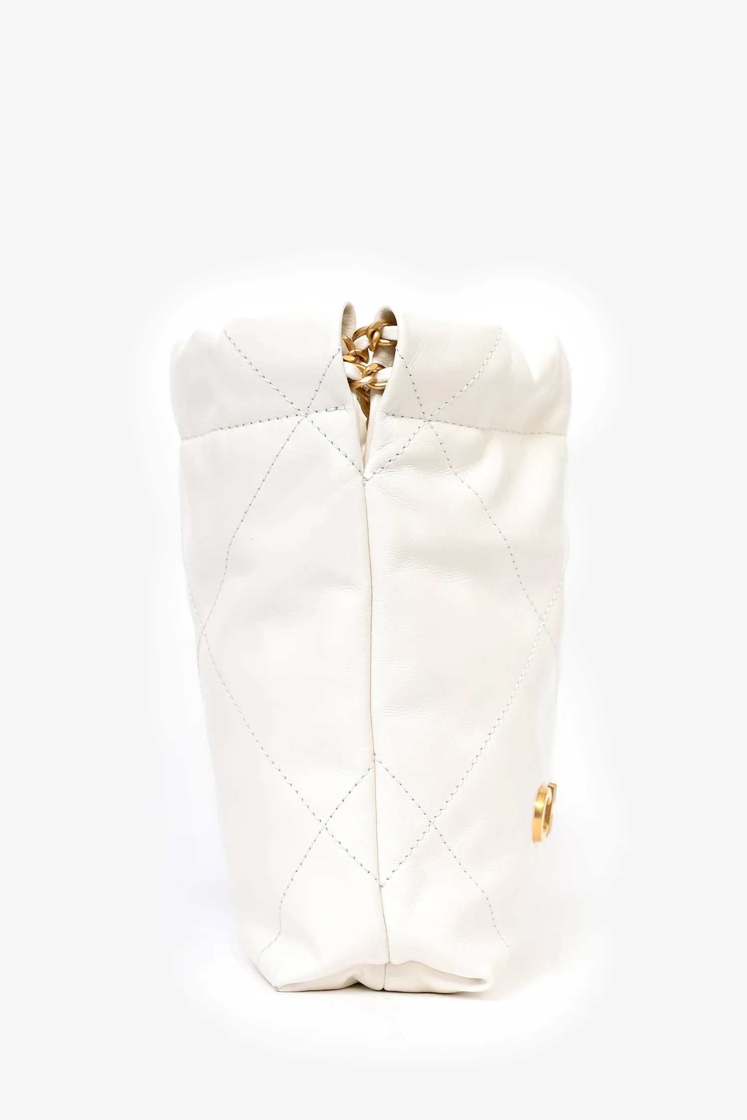 Pre-Loved Chanel™ 22 White Lambskin Mini Hobo. Top drawstring chain handle closure. Dual handle. Open compartment with a wall slip pocket. Gold-tone hardware. Tonal stitching.