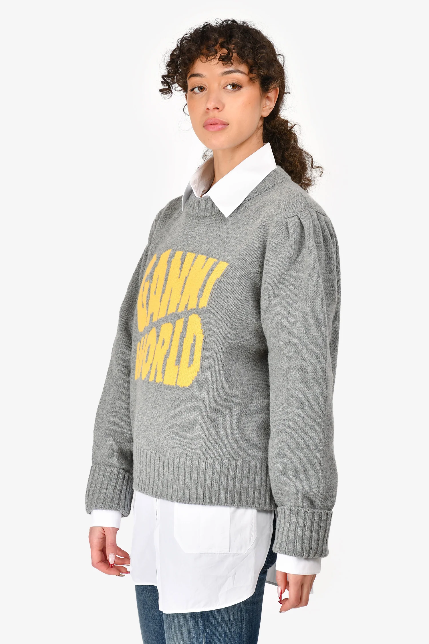 Ganni Grey Wool Logo Sweater. Ribbed crew neckline. Ribbed cuffs and hem. Featuring a bold yellow logo embroidered on the front. Tonal stitching.