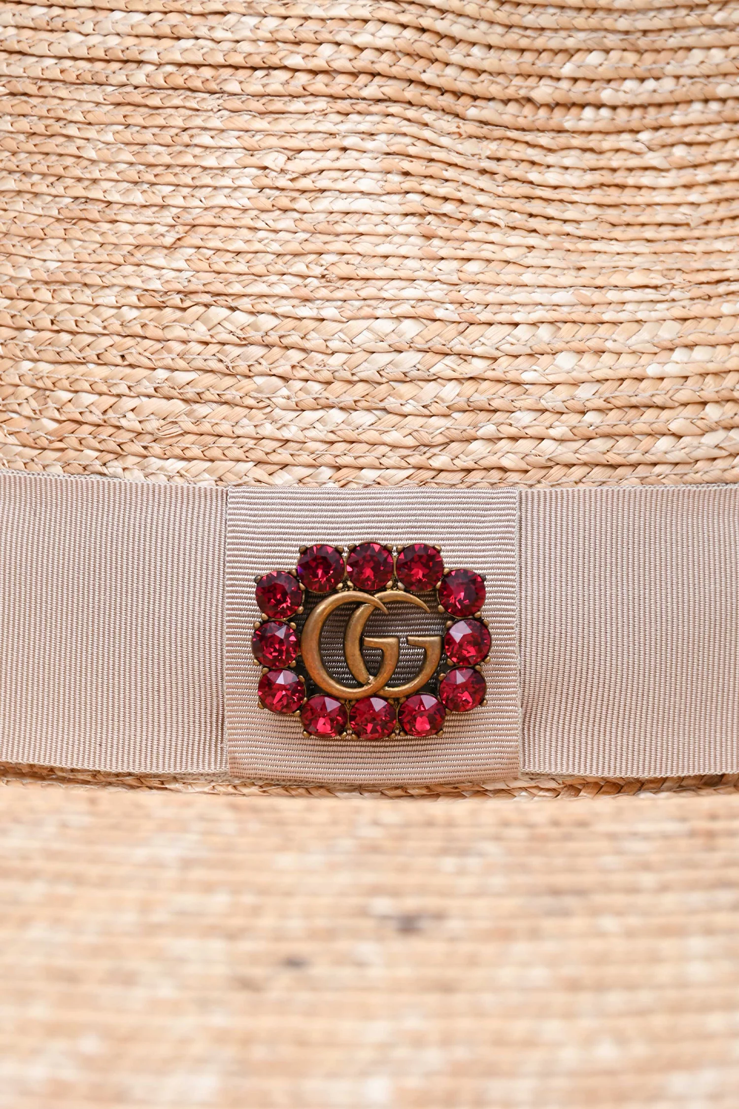 Gucci Beige Straw Wide-Brim GG Crystal Embellished Hat. Wide brim. GG logo embellishment with crystals at front. Unlined. Tonal stitching.