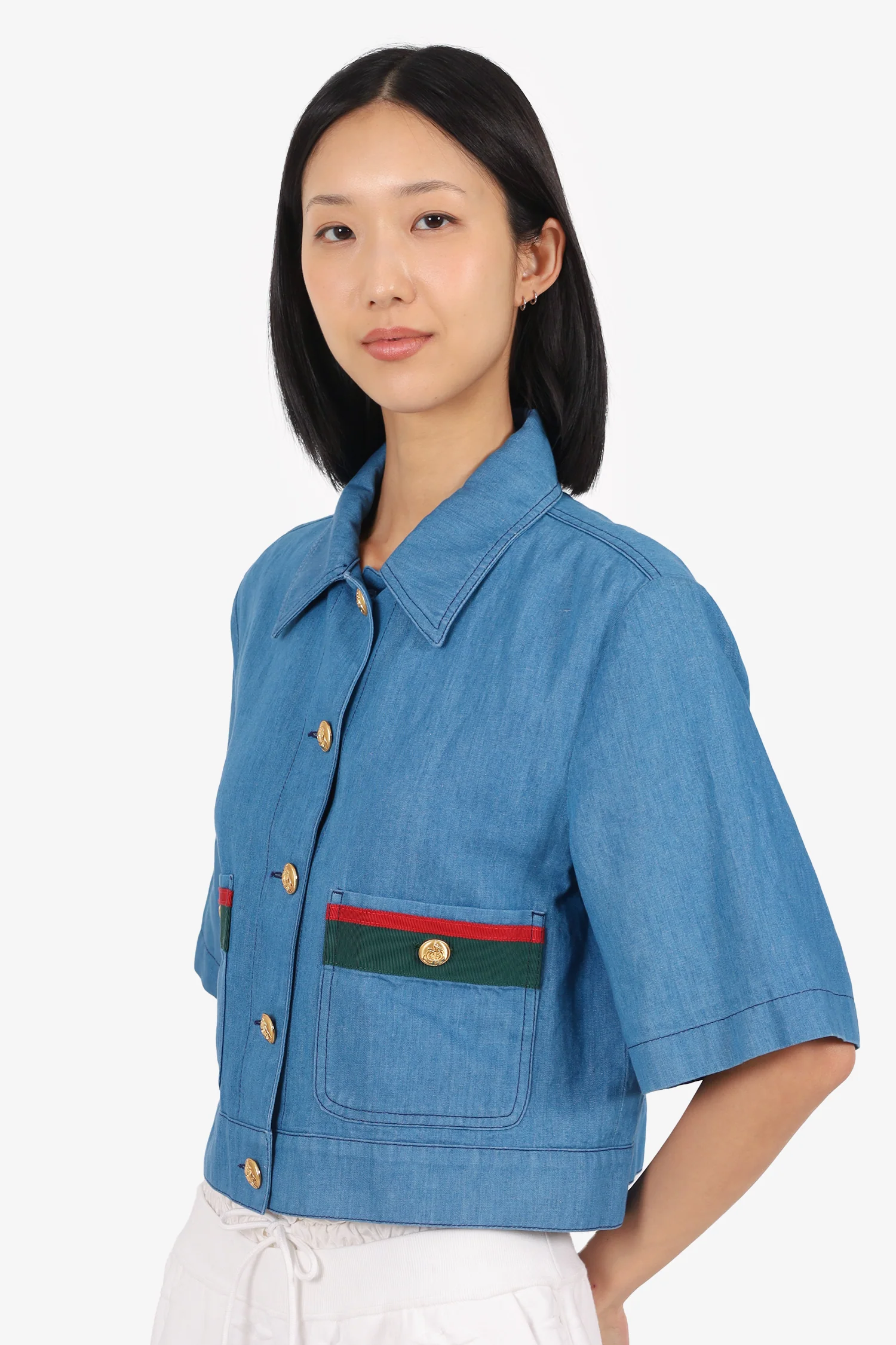 Gucci Blue Short Sleeve Jacket With Web Stripe. Pull-on. Collared-neckline. Front button-up closure. 2 front exterior slip pockets with button-up closure. Lined interior. Gold-tone hardware. Tonal stitching.