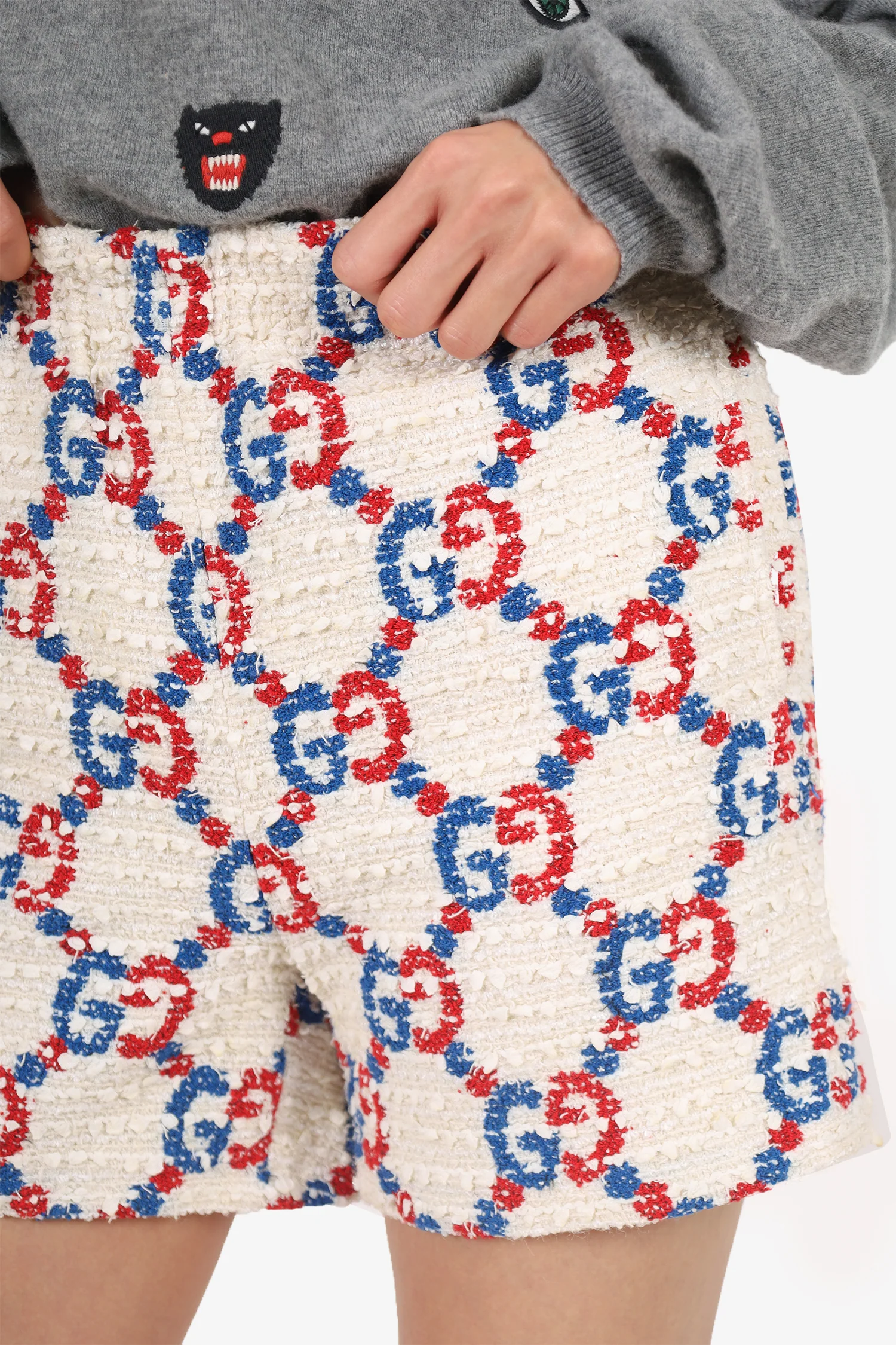 Gucci White/Red/Blue GG Sylvie Tweed Shorts. Slip-on. Elasticized waistband. 2 exterior side slip pockets. Lined interior. Tonal stitching.