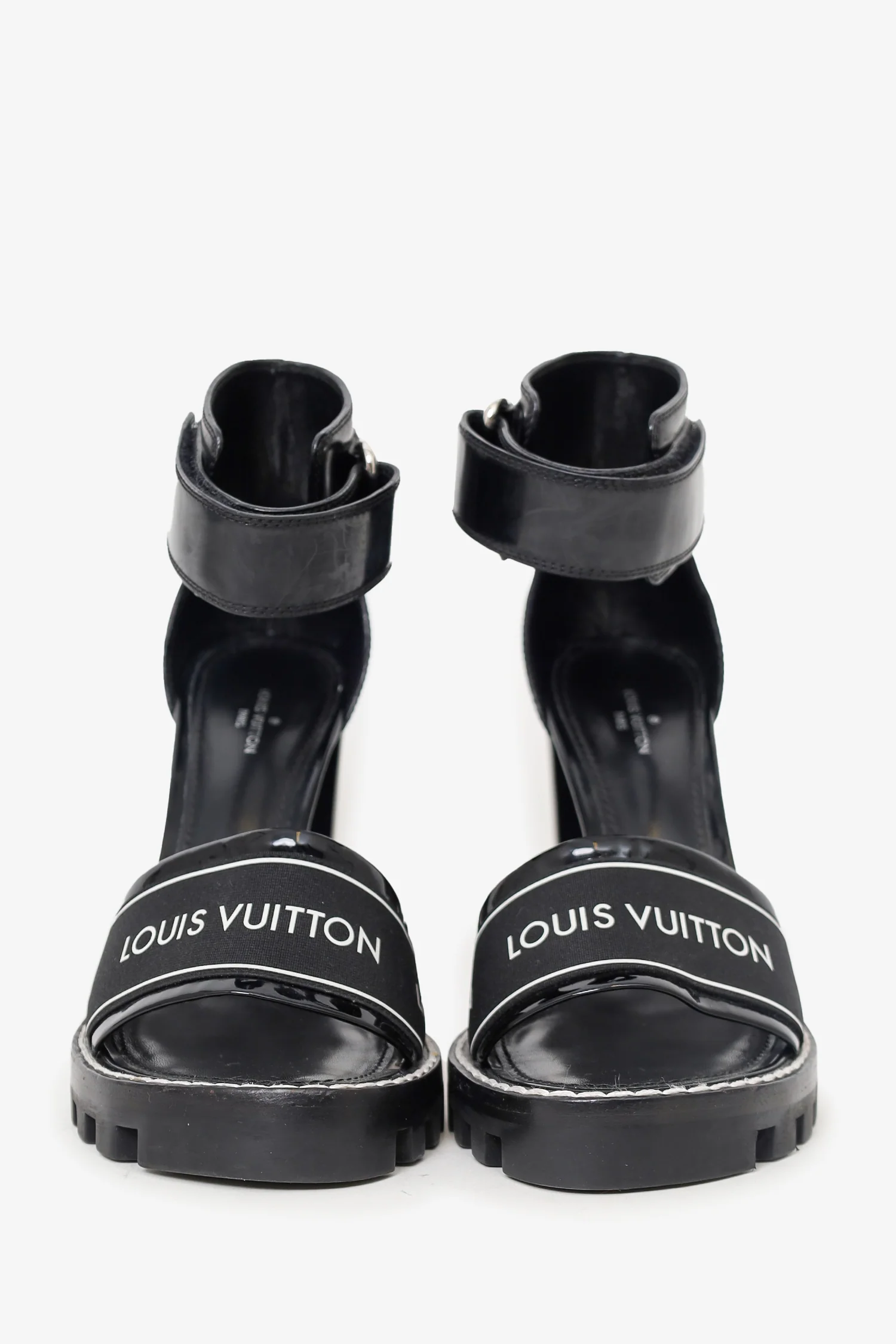 Louis Vuitton Black Glazed Calfskin Star Trail Sandals Size 38.5. Slip on. Pointed-round open toe. Adjustable ankle strap with velcro closure. Tonal and contrast stitching.