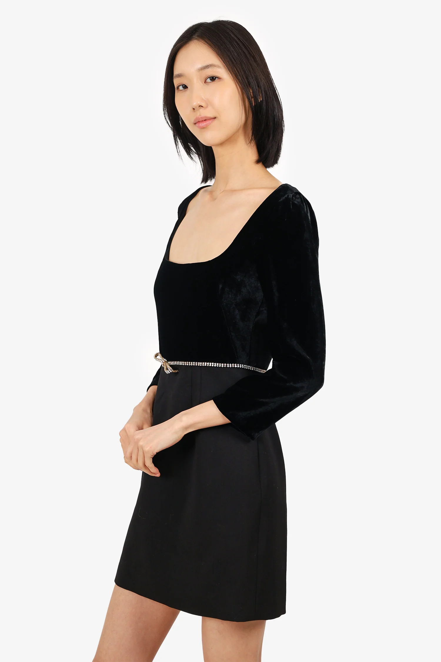 Miu Miu Black Wool/Velvet Crystal-embellished Bow Crepe Mini Dress. Slip-on. Square-neckline. Rear zip with hook closure. Bow detail at front of waistline. Lined interior.