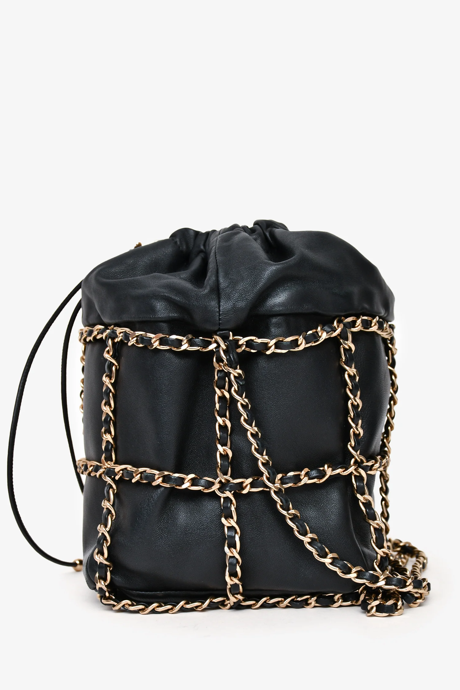 Pre-Loved Chanel™ 2019-20 Black Lambskin Bucket Bag. Drawstring closure with interwoven leather and chain detail. Leather-threaded chain shoulder strap with adjustable length. Lined interior with one card-slip pocket. Gold-tone hardware. Tonal stitching.