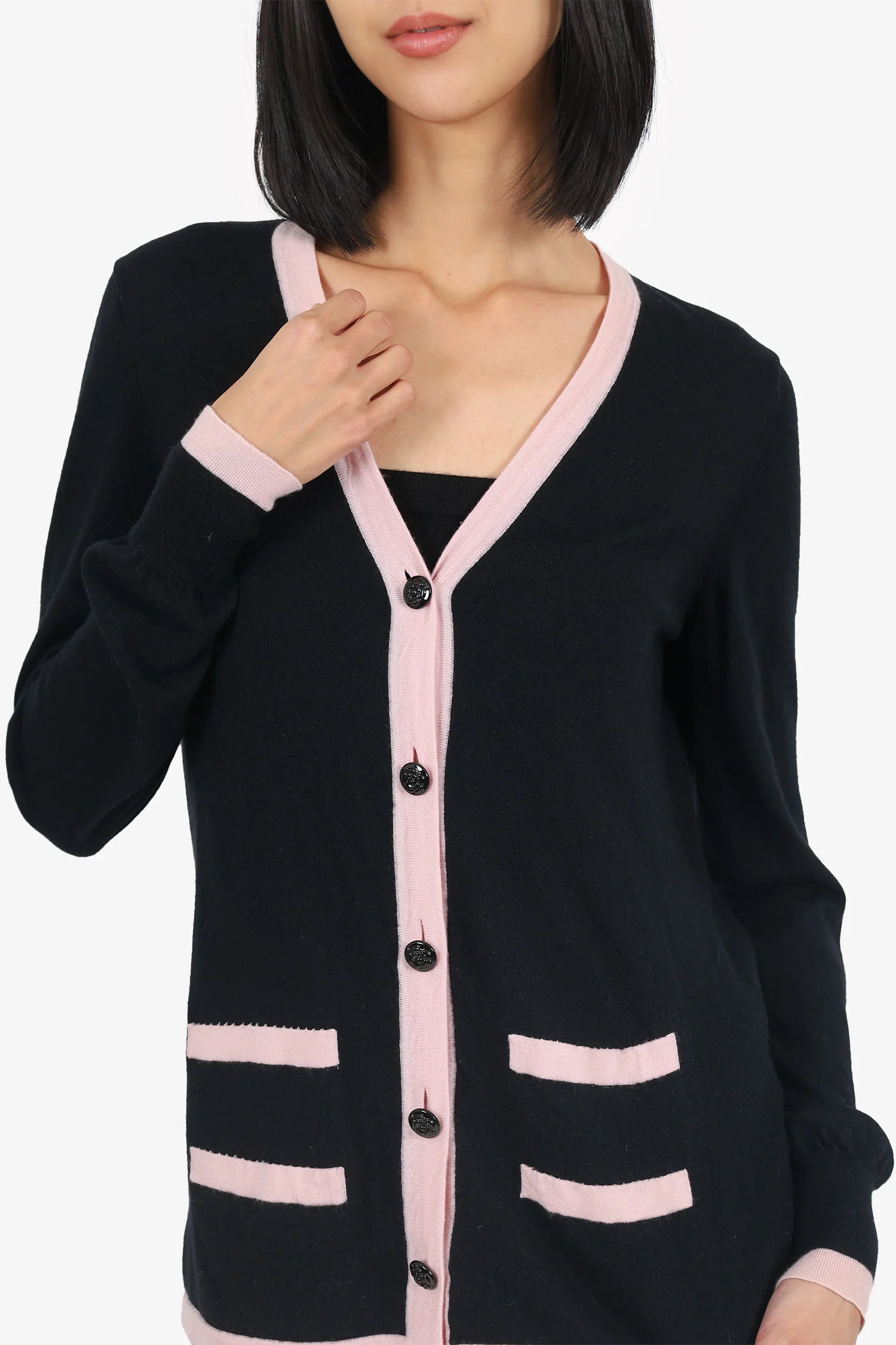 Pre-Loved Chanel™ Black/Pink Cardigan. Pull-on. V-neckline. Front button-up closure. Tonal stitching.