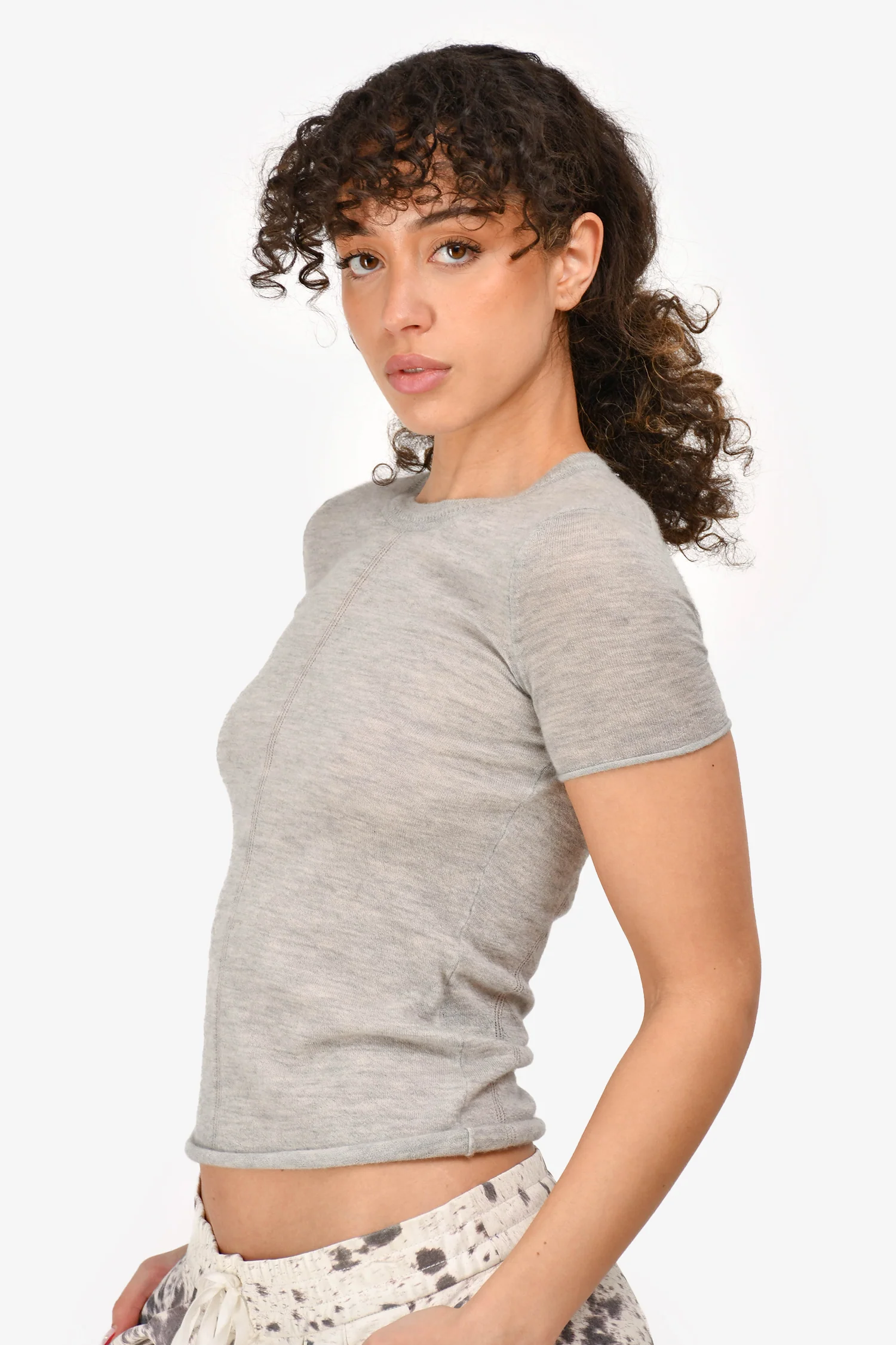 Rag & Bone Grey Cashmere Crewneck Short Sleeve Sweater. Rolled hem and sleeve cuffs. Tonal stitching.